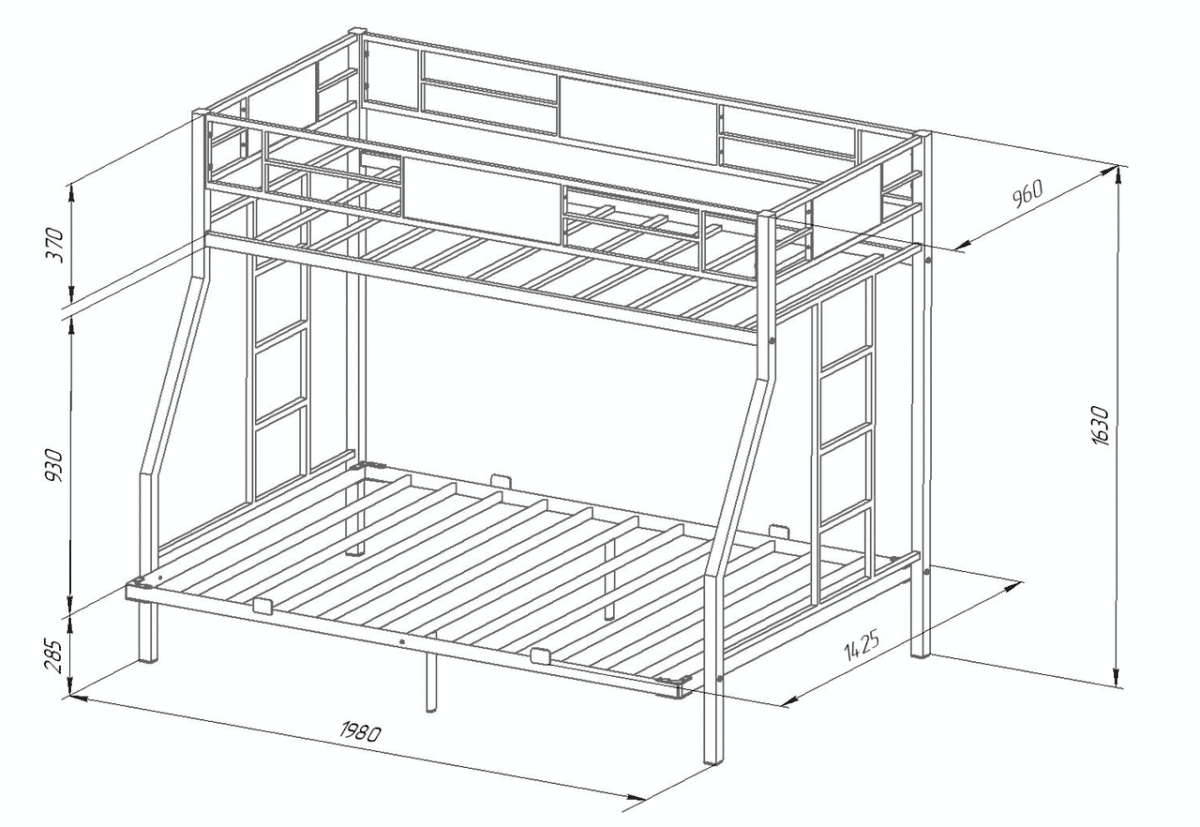 Металлическая кровать двухъярусная Гранада 140 черная способна выдерживать нагрузку до 180 кг (на одно спальное место), что делает ее подходящей как для детей так и для взрослых. В отличие от кроватей из ЛДСП выглядит менее громоздкой. В комплект входят две лестницы по бокам кровати.