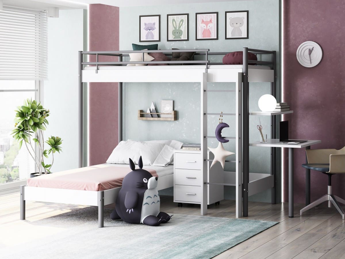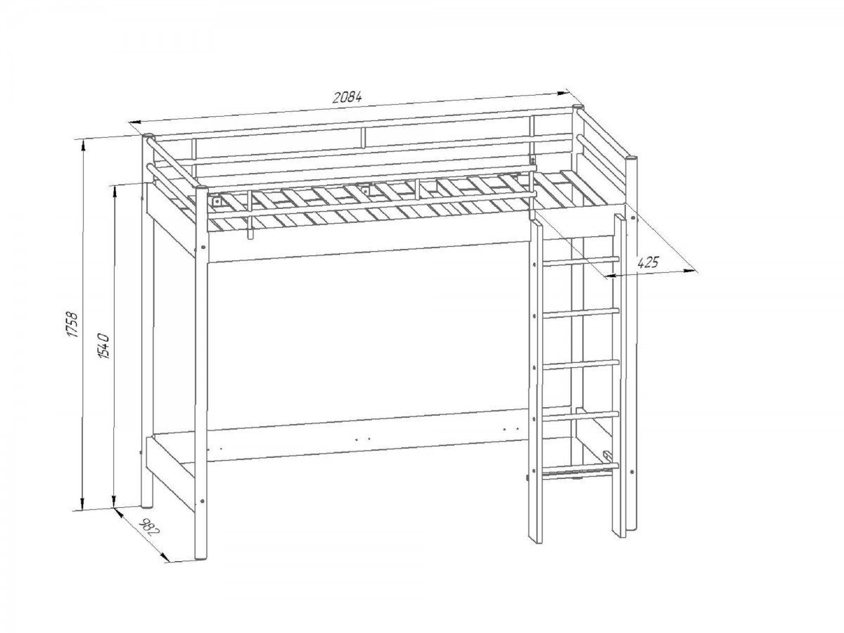 Кровать-чердак «Хельга» – прекрасное решение, настоящий комплекс, где есть все необходимое для ребенка или подростка. На втором этаже конструкции расположено спальное место, взобраться на которое можно по специальной лестнице. Бортик, проходящий по всему периметру второго яруса, предупреждает случайное падение. Нижний этаж пустой, и его можно укомплектовать тумбой, столешницей, полками, еще одной кроватью или диваном, со стороны прикрепить стол с полкой.