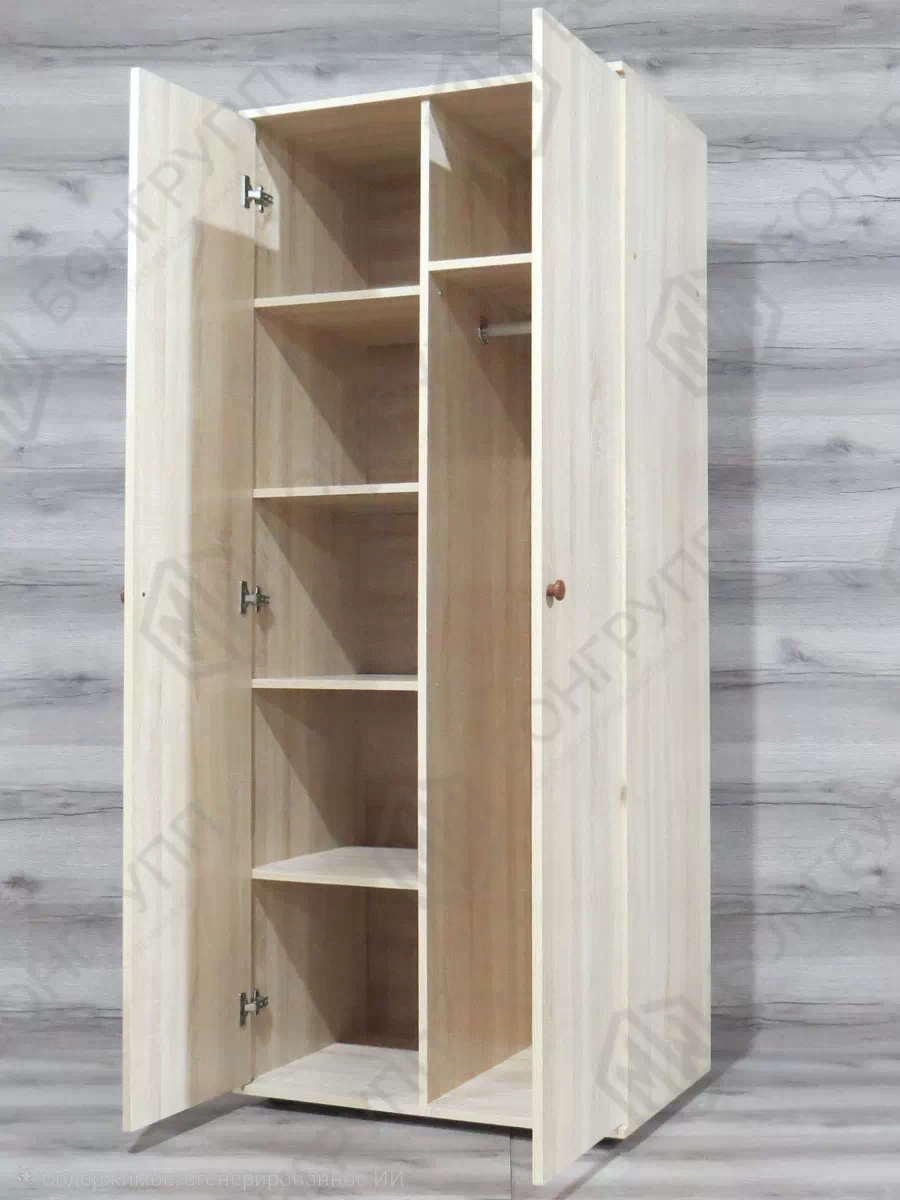 - Продуманная организация пространства: Шкаф оснащен вместительными полками для носильных вещей и постельных принадлежностей, а также имеет отделение с выдвижной штангой для одежды на вешалках.