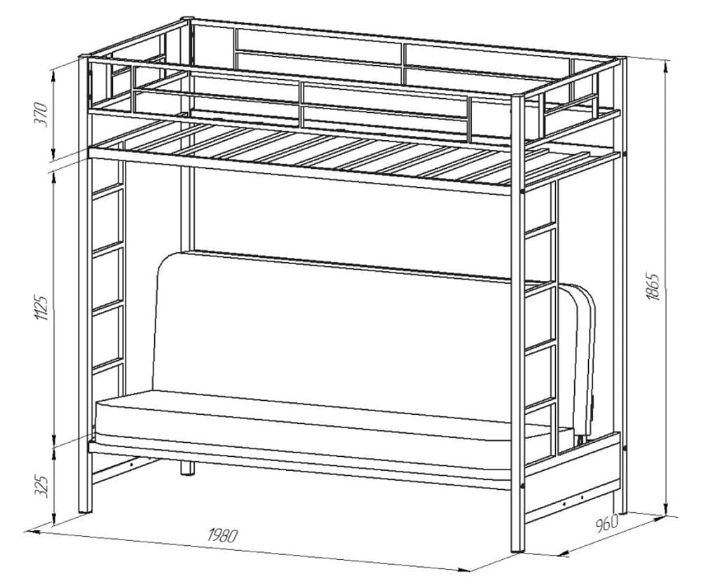 Металлическая кровать двухъярусная с диваном Мадлен белая изготавливается в конфигурации с раскладным диваном. Благодаря этому, вы получаете широкое раскладное спальное место внизу. Такая двухъярусная кровать отлично подходит для детской комнаты. В комплект входят две лестницы по бокам кровати.