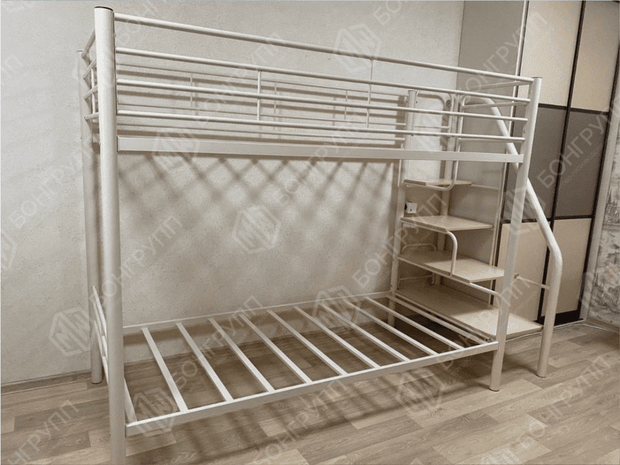 Все металлические элементы кровати покрыты износоустойчивой краской без запаха. Двухъярусную кровать можно собирать и разбирать неограниченное количество раз, и от этого она не потеряет в прочности и качестве.